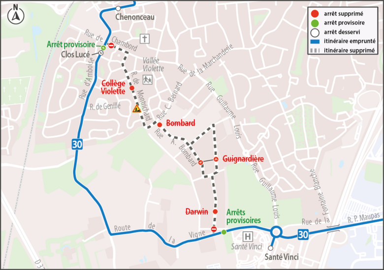 30Les arrêts Collège Violette, Bombard, Guignardière et Darwin ne sont pas desservis par la ligne 30 dans les deux sens.