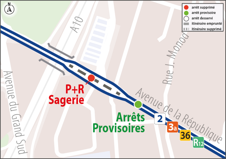 23a36R12Les arrêts P+R Sagerie ne sont pas desservis par les lignes 2, 3a, 36 et R12 (deux sens).