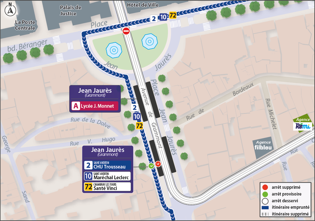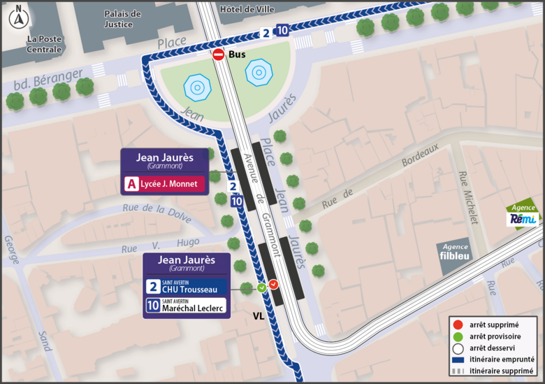 210L'arrêt Jean Jaurès n'est pas desservi par les lignes 2 direction CHU Trousseau, et 10 direction Maréchal Leclerc.