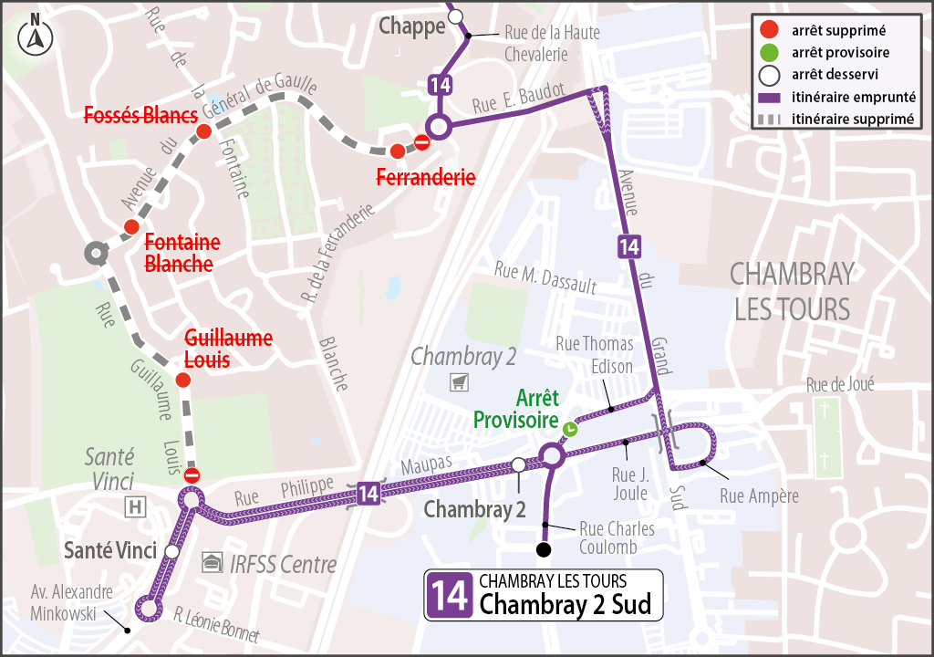 14Les arrêts Ferranderie, Fossés Blancs, Fontaine Blanche et Guillaume Louis ne sont pas desservis par la ligne 14 dans les deux sens.