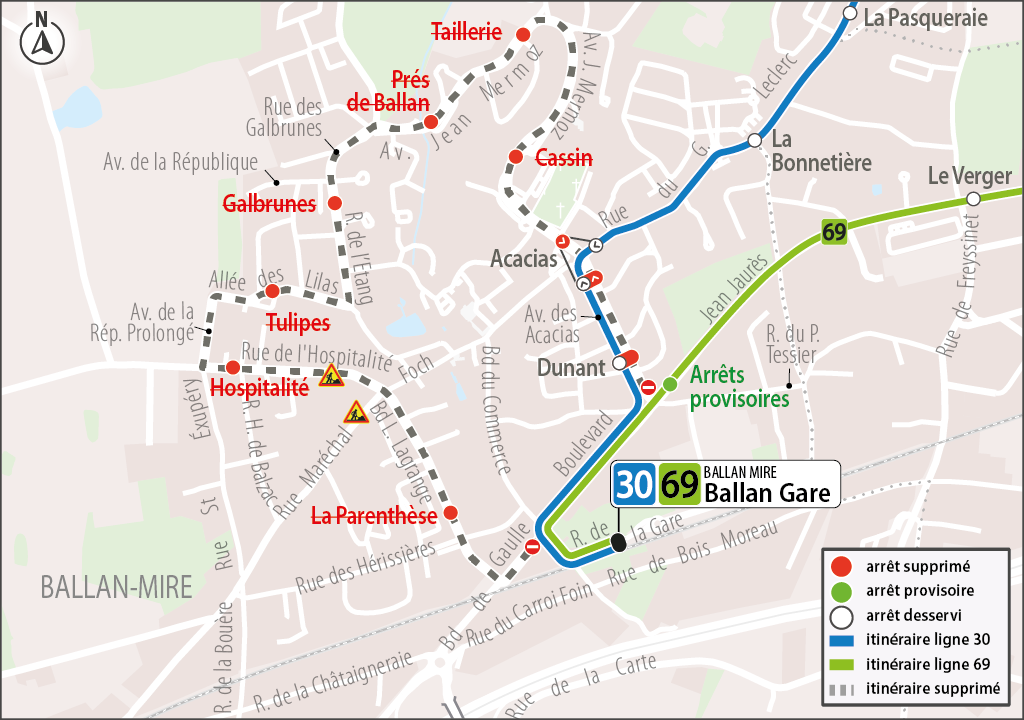 3069Les arrêts Parenthèse, Hospitalité, Tulipes, Galbrunes, Prés de Ballan, Taillerie, Cassin ne sont pas desservis par les lignes 30 et 69dans les deux sens. L'arrêt Acacias n'est pas desservi par la ligne 30 direction CHU Trousseau et la ligne 69dans les deux sens. L'arrêt Dunant n'est pas desservi par la ligne 69 dans les deux sens.