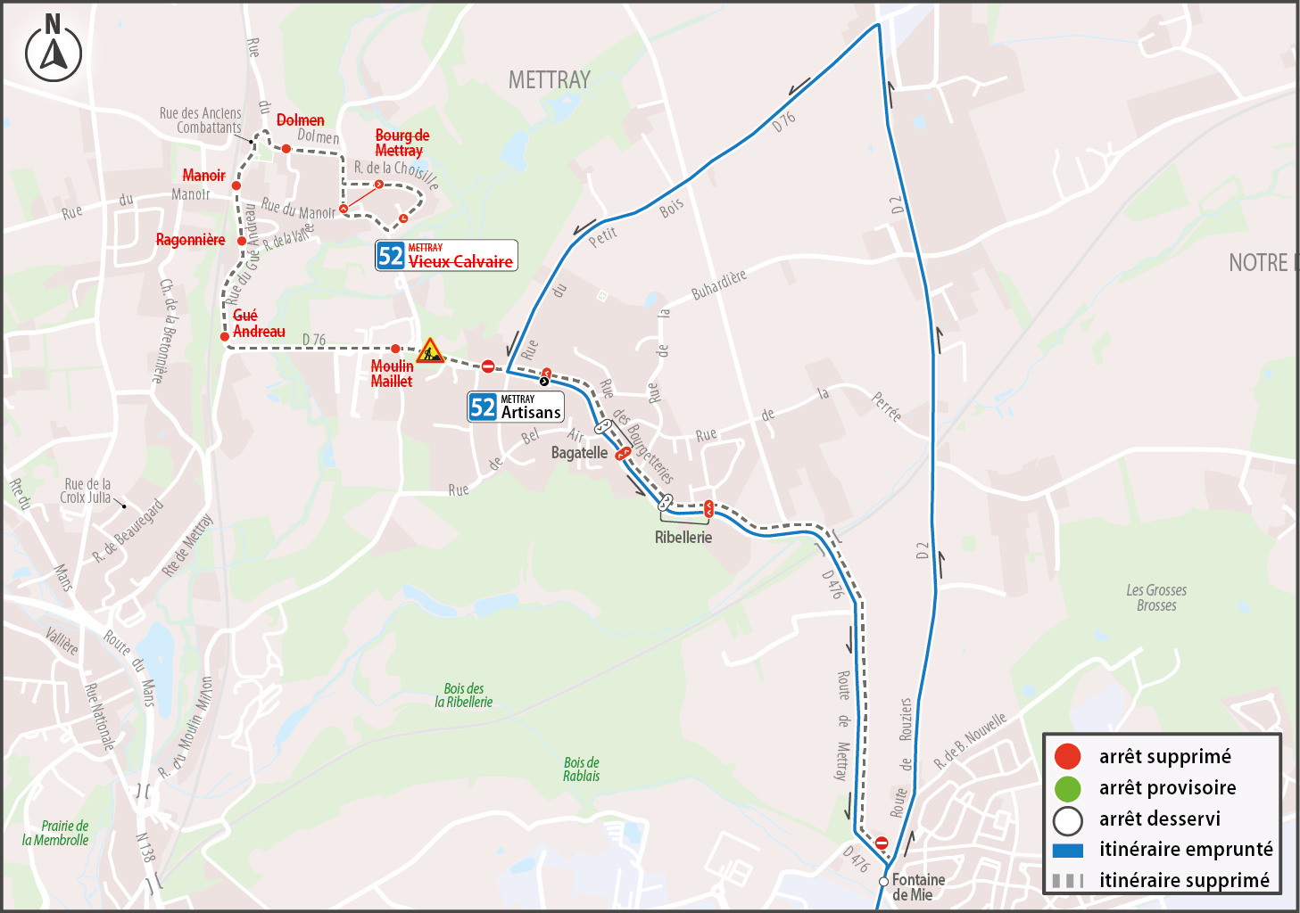 52Les arrêts Vieux Calvaire, Bourg de Mettray, Dolmen, Manoir, Ragonnière, Gué Andreau, et Moulin Maillet ne sont pas desservis par la ligne 52 deux sens. Ainsi que les arrêts Ribellerie, Bagatelle et Artisans ne sont pas desservis par la ligne 52 (uniquement direction Vieux Calvaire).
