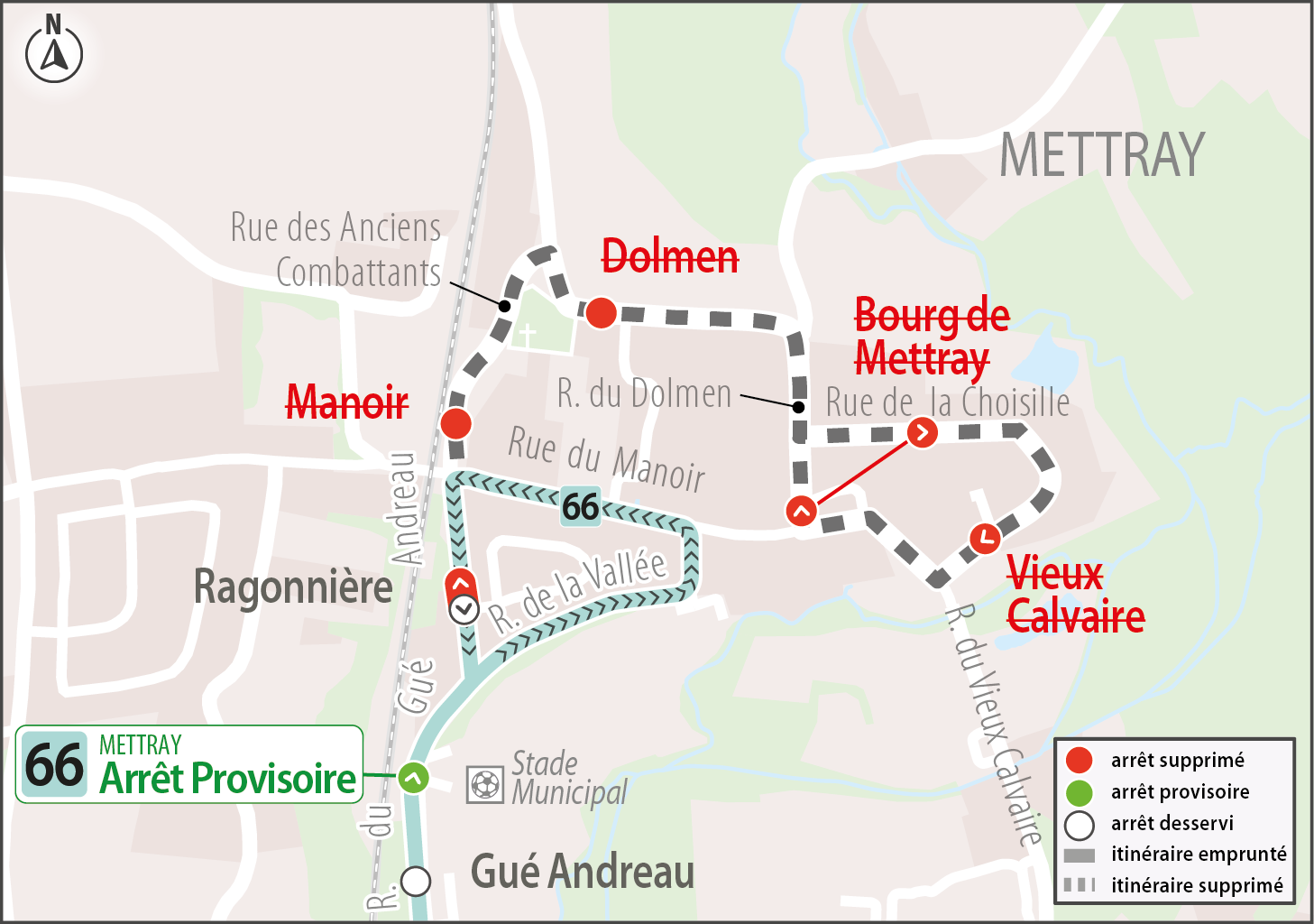 66Les arrêts Vieux Calvaire, Bourg de Mettray, Dolmen, Manoir deux sens, et Ragonnière uniquement direction Vieux Calvaire ne sont pas desservis par la ligne 66.