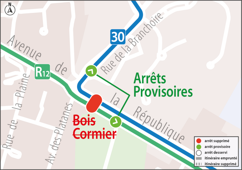 30R12Les arrêts Bois Cormier ne sont pas desservis par les lignes 30 et R12 deux sens.
