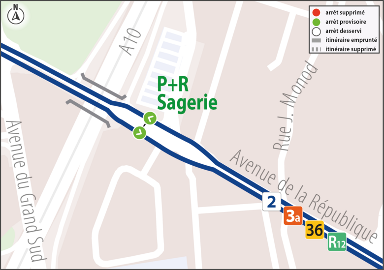 23a36R12Les arrêts P+R Sagerie ne sont pas desservis par les lignes 2, 3a, 36 et R12 dans les deux sens.