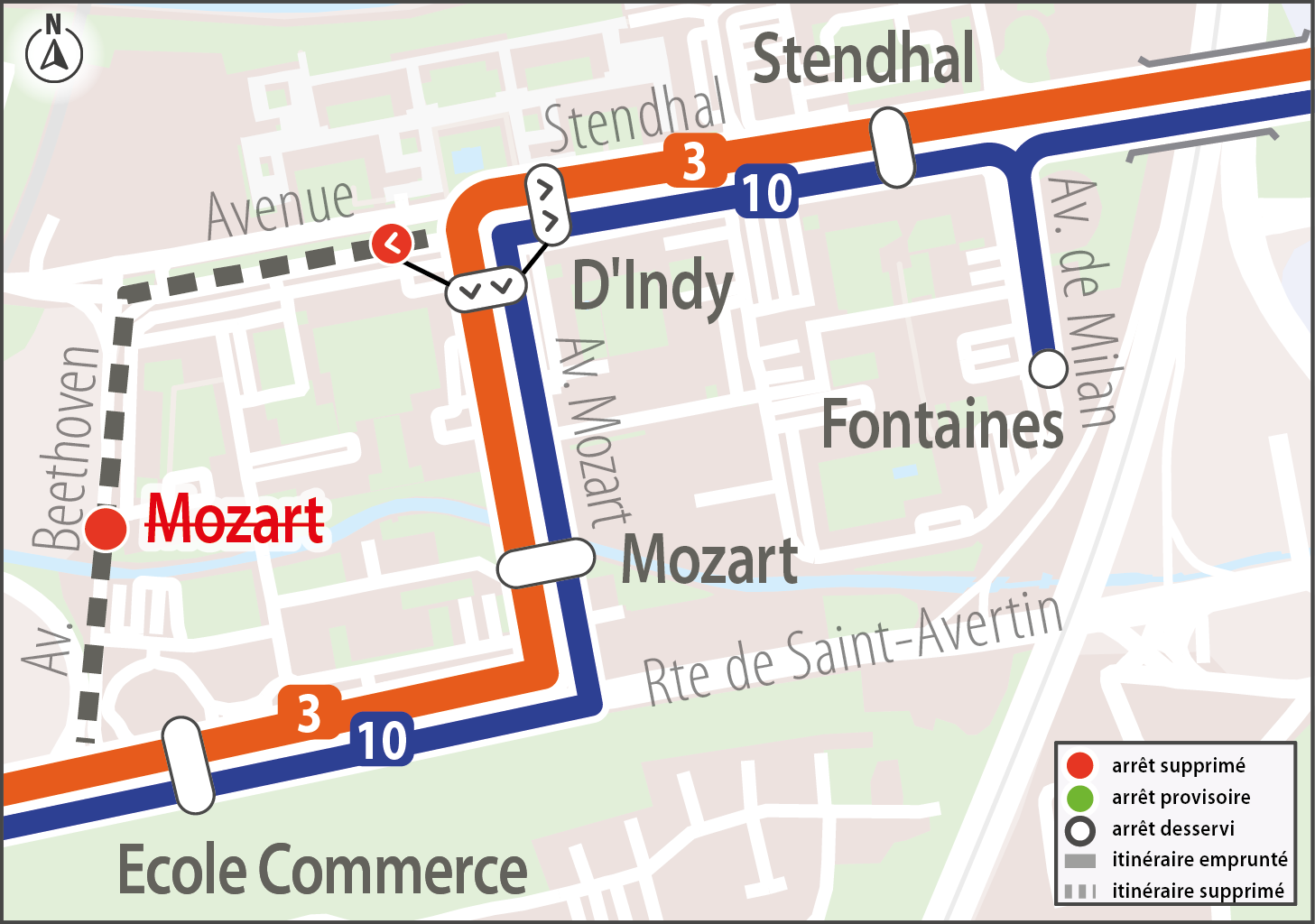 Ligne 3ab et 10 > D'Indy situé Avenue MozartLa Riche - Modification Itinéraire : Terminus La Riche Centre du mardi 7 avril au dimanche 23 août