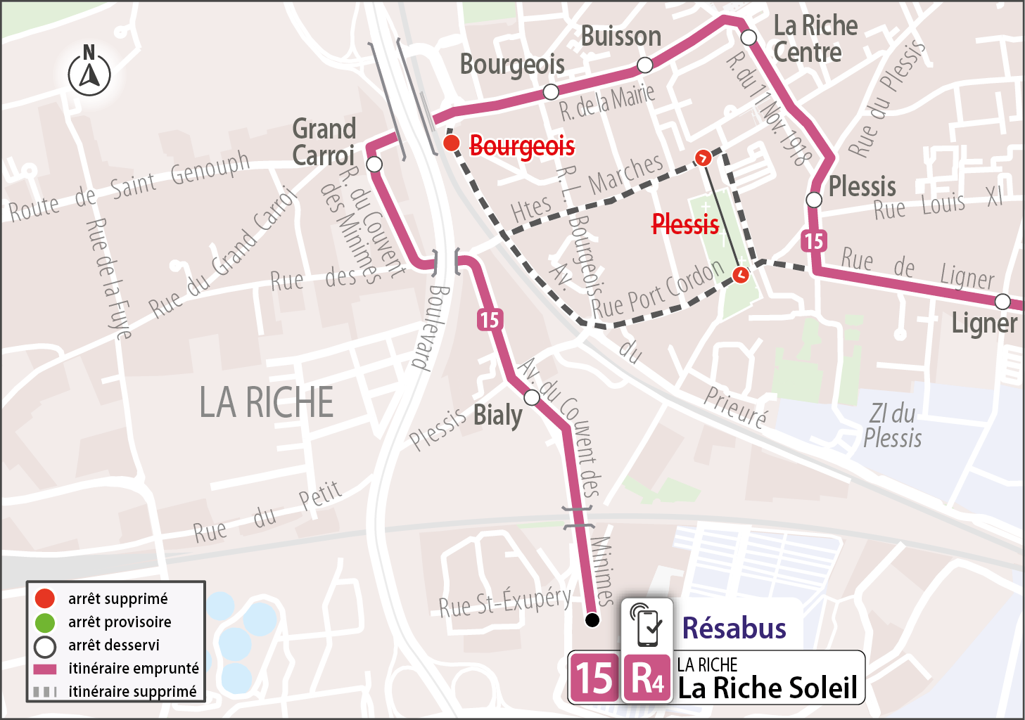 15A compter du samedi 20 décembre début de service, la ligne 15 emprunte de nouveau le Boulevard Tonnellé/la rue St François, la rue François Richer, la rue de Ligner, la rue du Plessis, la rue du 11 novembre 1918 et la rue de la Mairie.