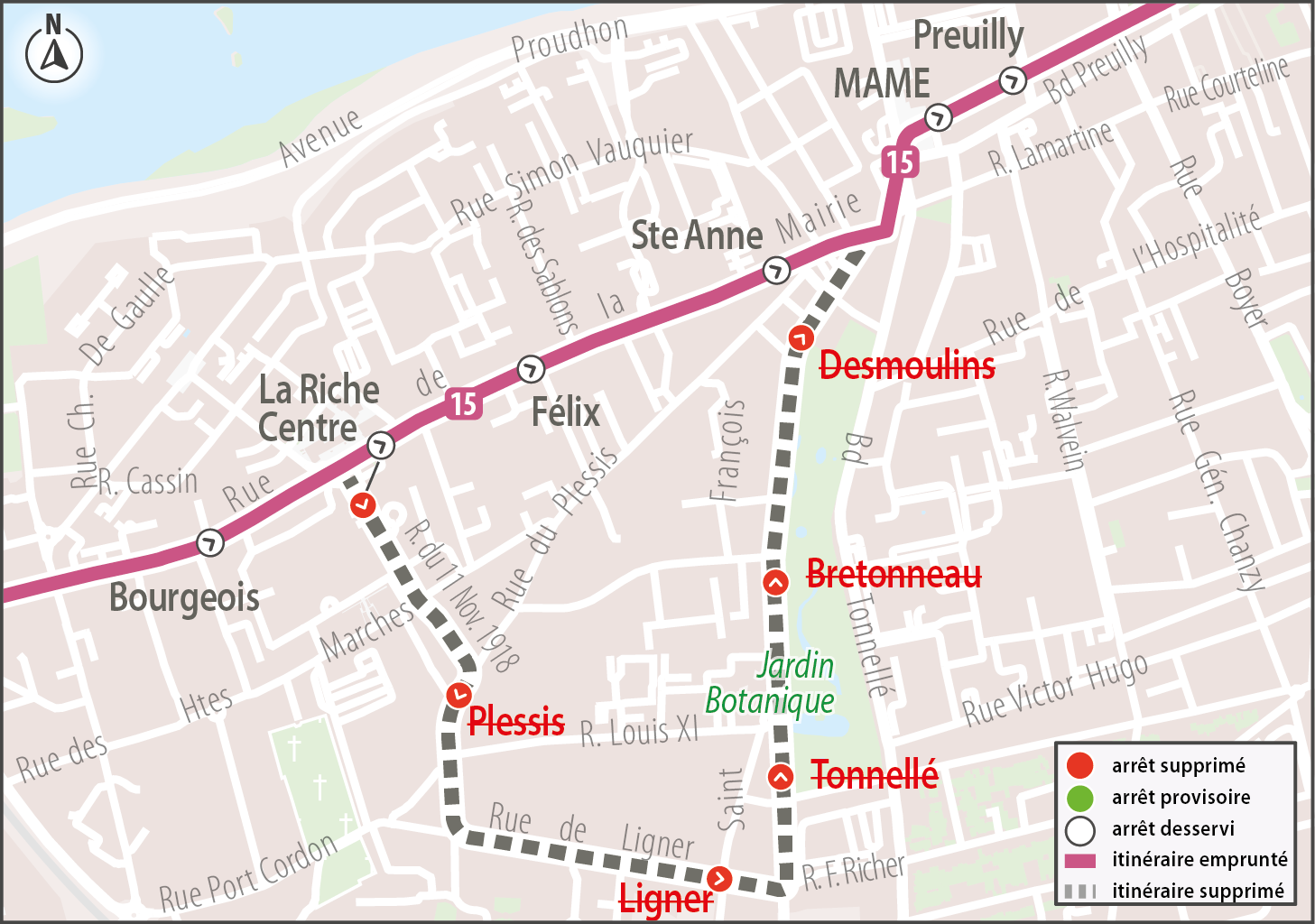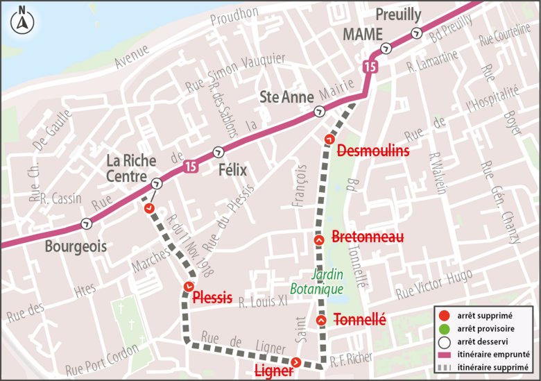 15Les arrêts La Riche Centre, Plessis, Ligner, Tonnellé, Bretonneau et Desmoulins ne sont pas desservis par la ligne 15 direction Blotterie.