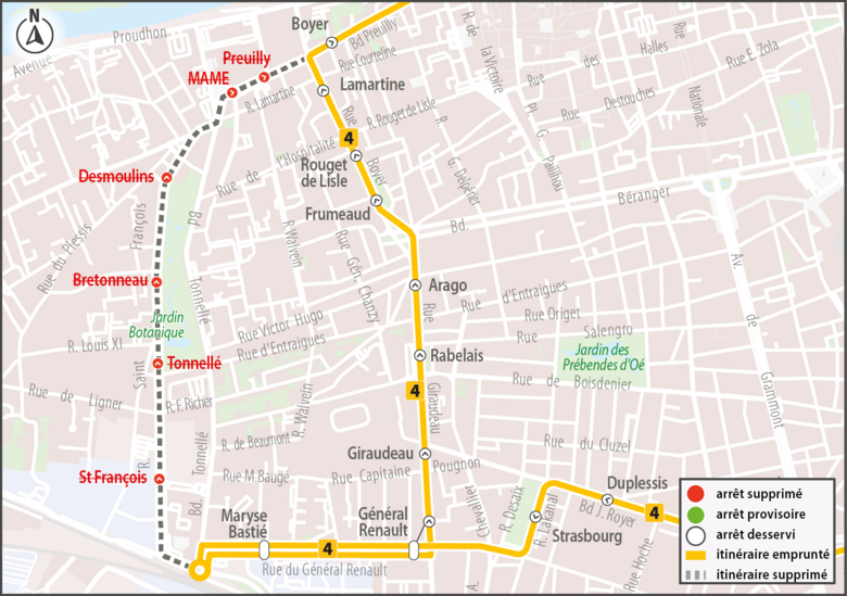 4Les arrêts St François, Tonnellé, Bretonneau, Desmoulins, MAME et Preuilly ne sont pas desservis par la ligne 4, direction Rempart.