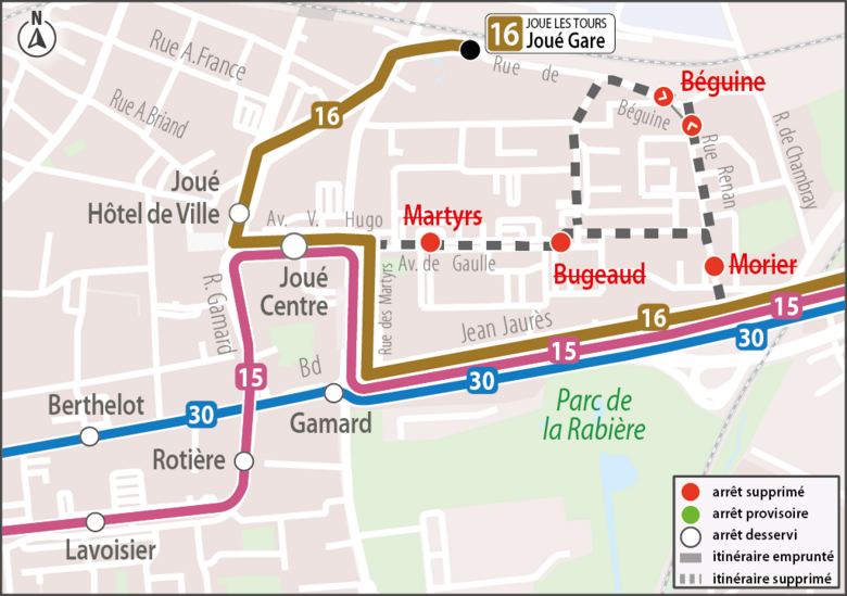 Se reporter aux arrêts Joué Centre situé avenue Victor Hugo pour les lignes 15 et 16, ou Gamard situé Boulevard Jean Jaurès pour la ligne 30.