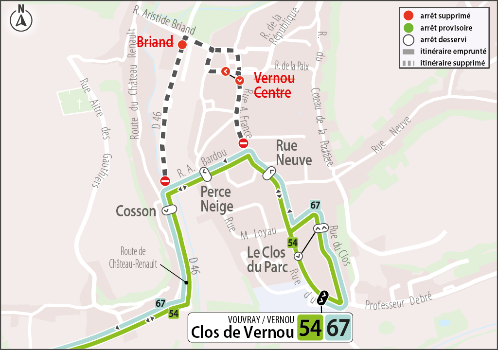 Les arrêts Vernou Centre et Briand ne sont pas desservis par les lignes 54 dans les deux sens et 67 direction Lycée Vaucanson.