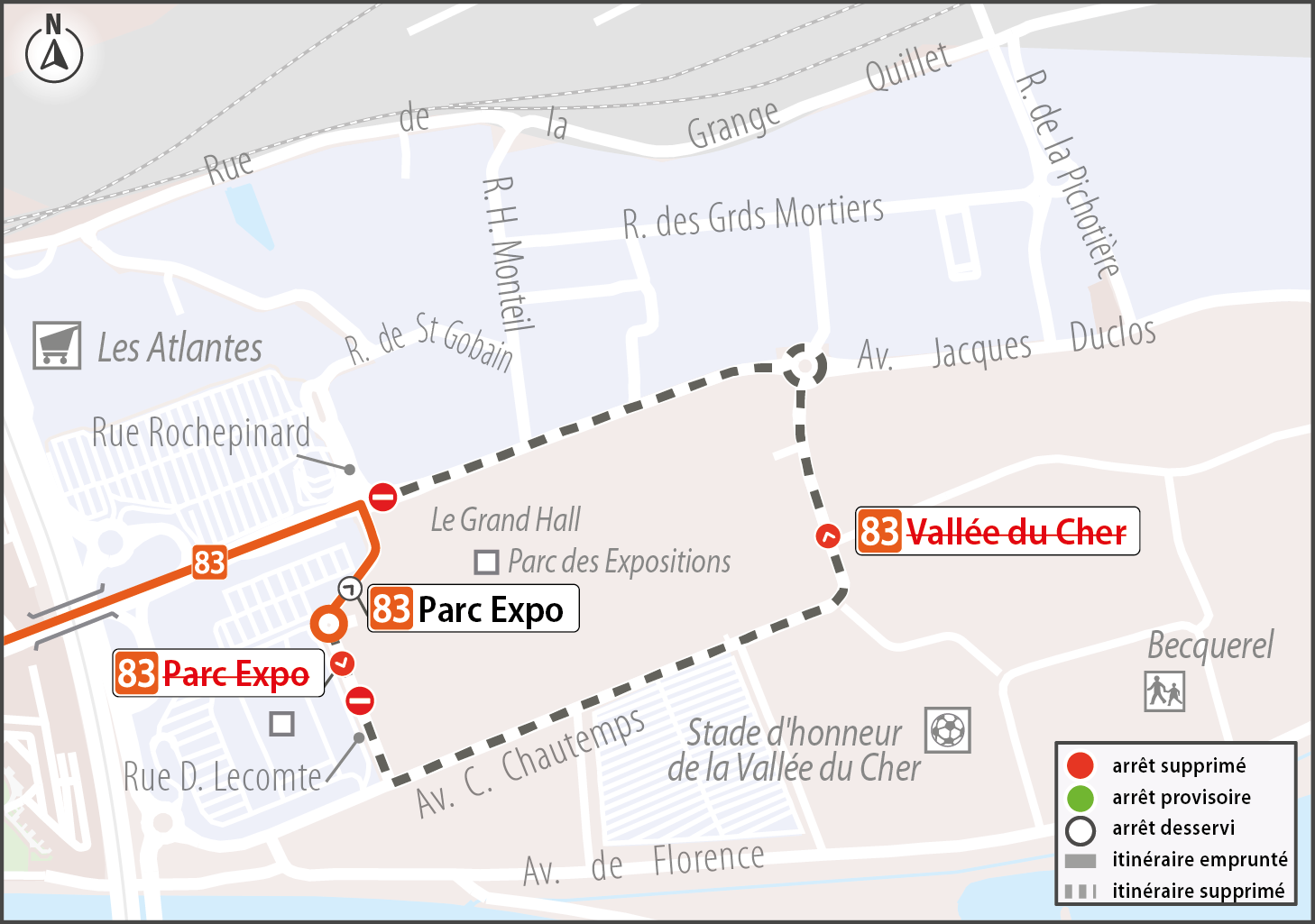 83Les arrêts Parc Expo (direction Vallée du Cher) et Vallée du Cher (deux sens) ne sont pas desservis par la ligne 83 pendant ces évènements.