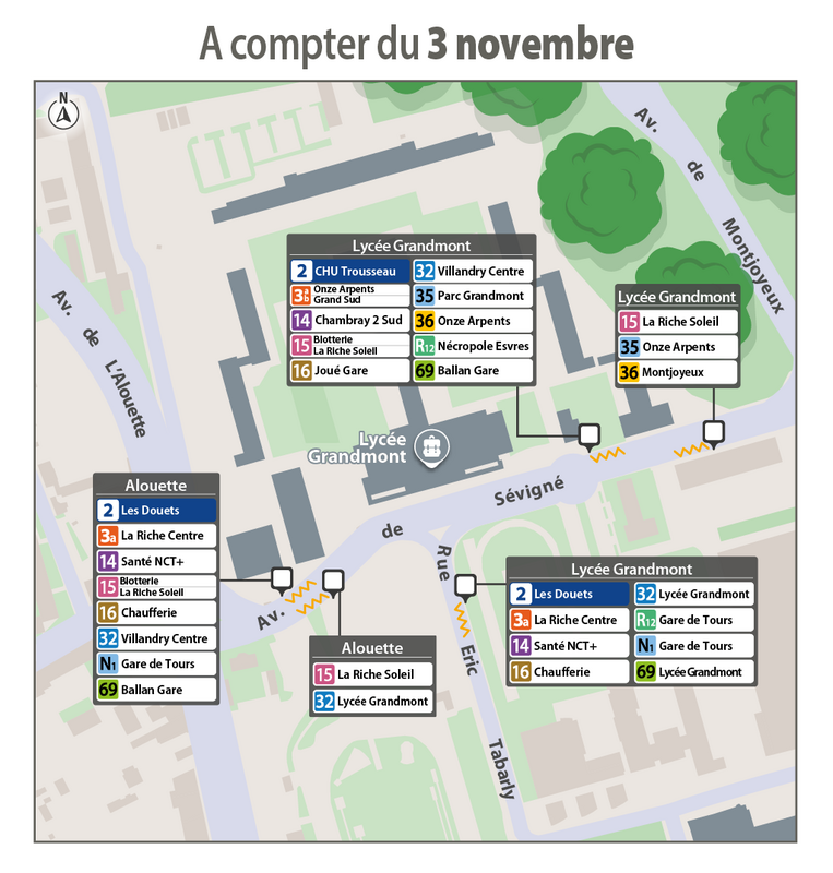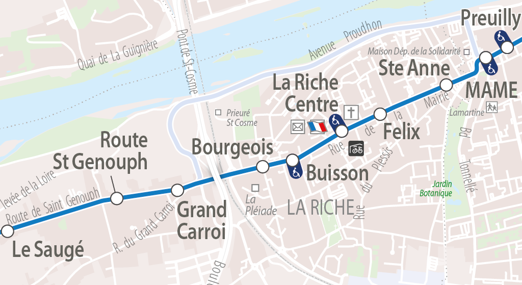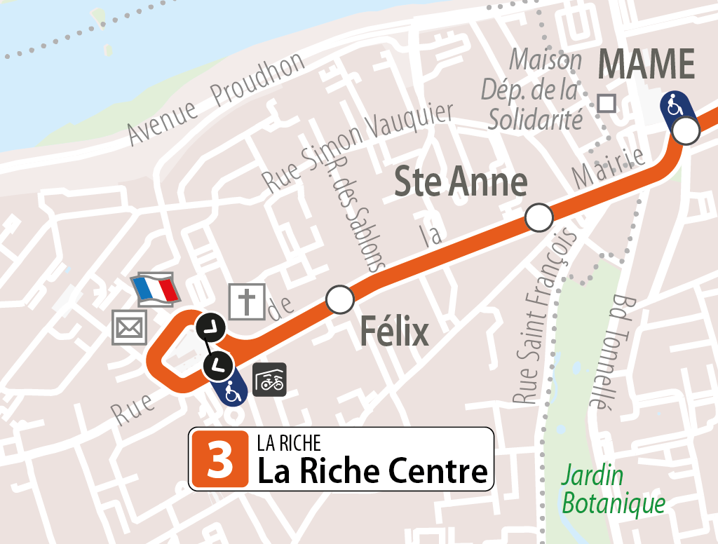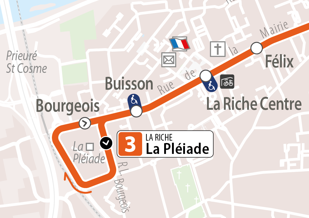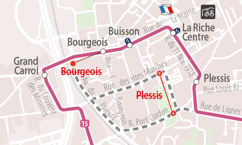 - Secteur La Riche, l'itinéraire de la ligne 34 est maintenu par la rue de la Mairie dans l'attente du début des travaux de la deuxième ligne de tram.