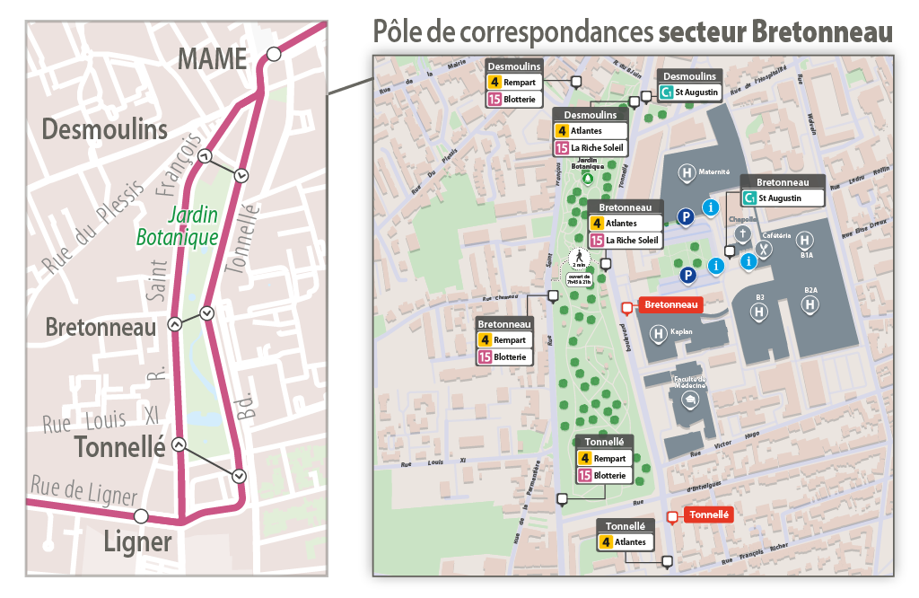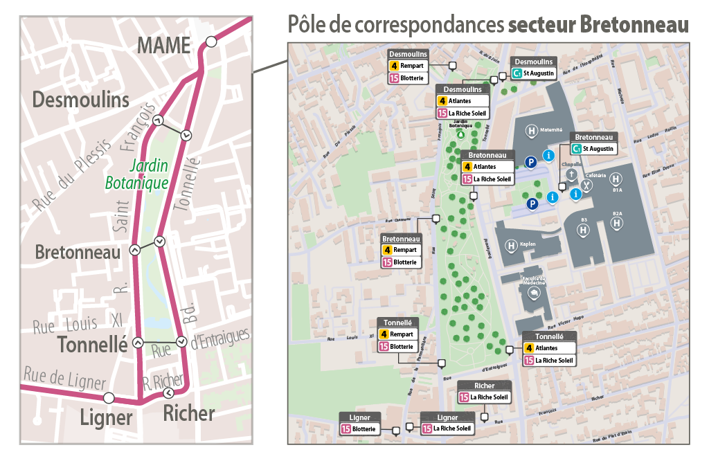 - Ligne 15 direction La Riche Soleil les arrêts Desmoulins, Bretonneau et Tonnellé sont desservis Boulevard Tonnellé. La ligne emprunte la rue François Richeret dessert l'arrêt Richer.