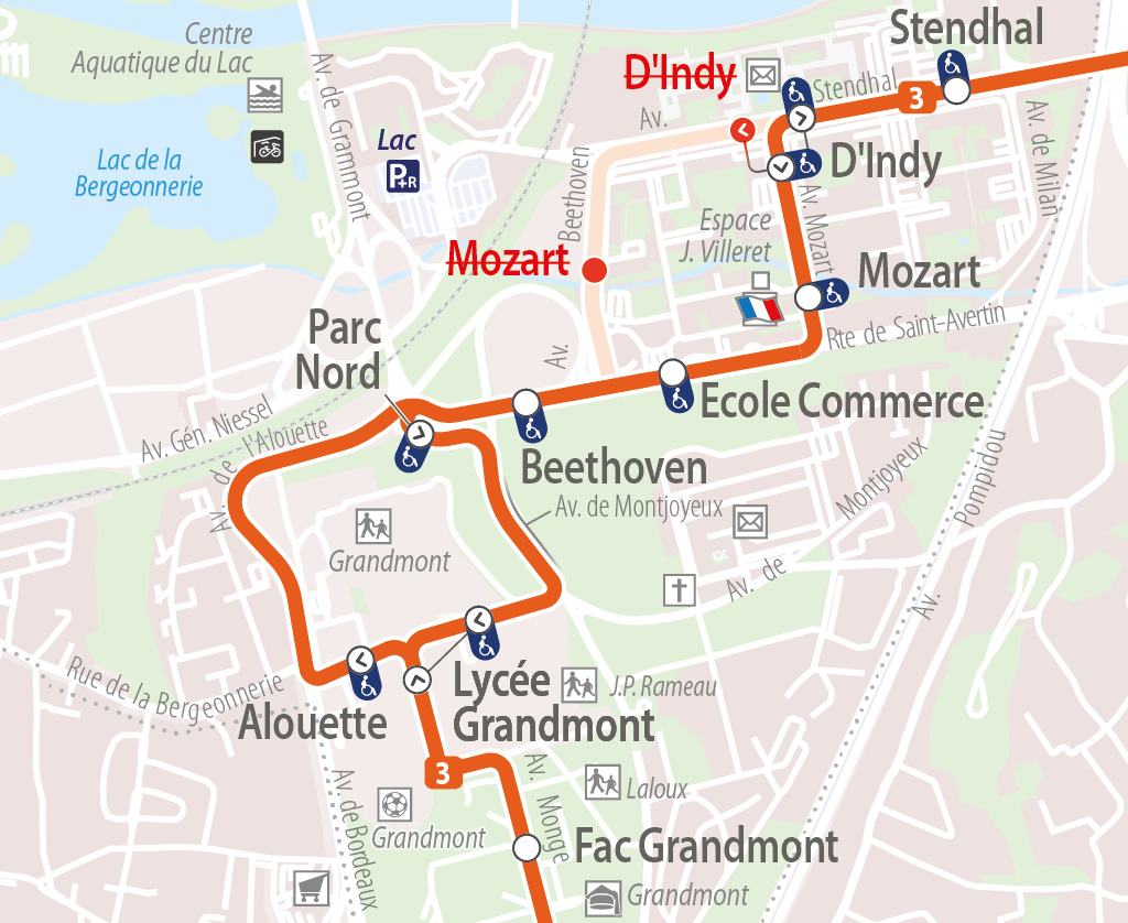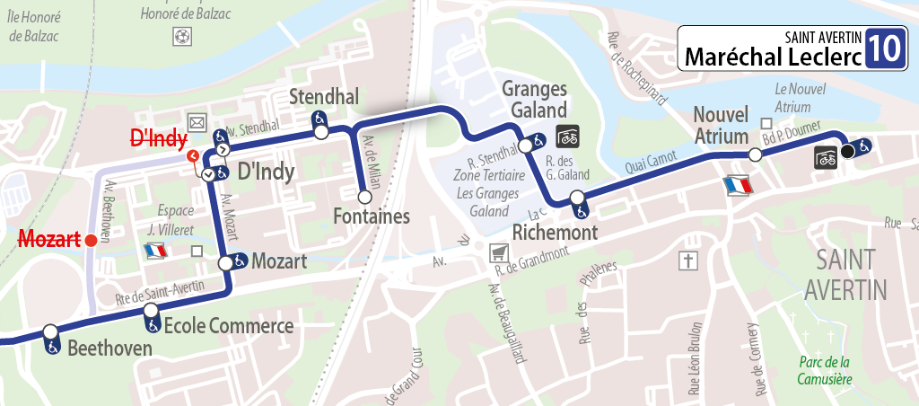 - Secteur des Fontaines à Tours, l'itinéraire de la ligne 10 est maintenu par la route de St Avertin et l'avenue Mozart dans l'attente du début des travaux de la deuxième ligne de tram.