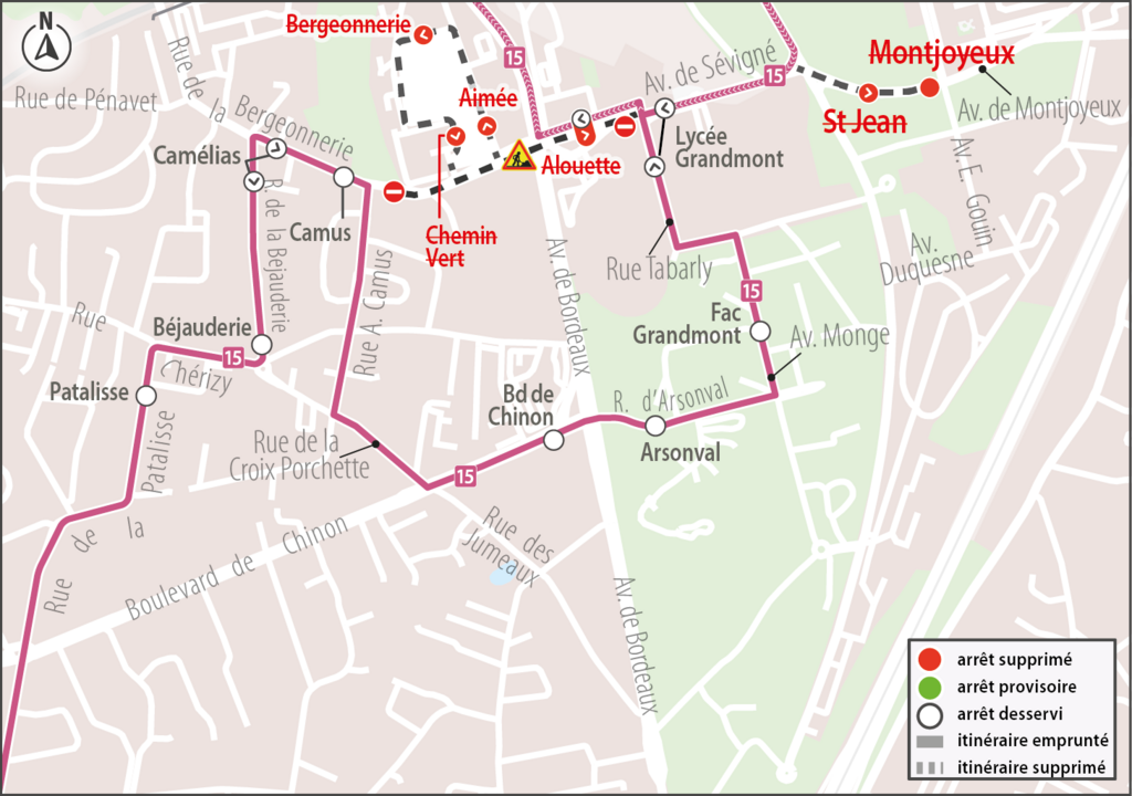 - La ligne 15 emprunte la rue Albert Camus, la rue de la Croix Porchette, le Boulevard de Chinon, la rue d'Arsonval, l'Avenue Monge, la rue Tabarly. Les quartiers de la Bergeonnerie et de Montjoyeux ne sont pas desservis.