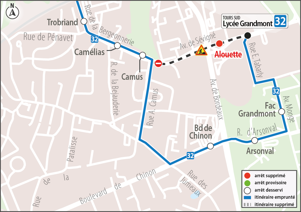 - L'arrêt Alouette n'est pas desservi en direction de La Riche Soleil.