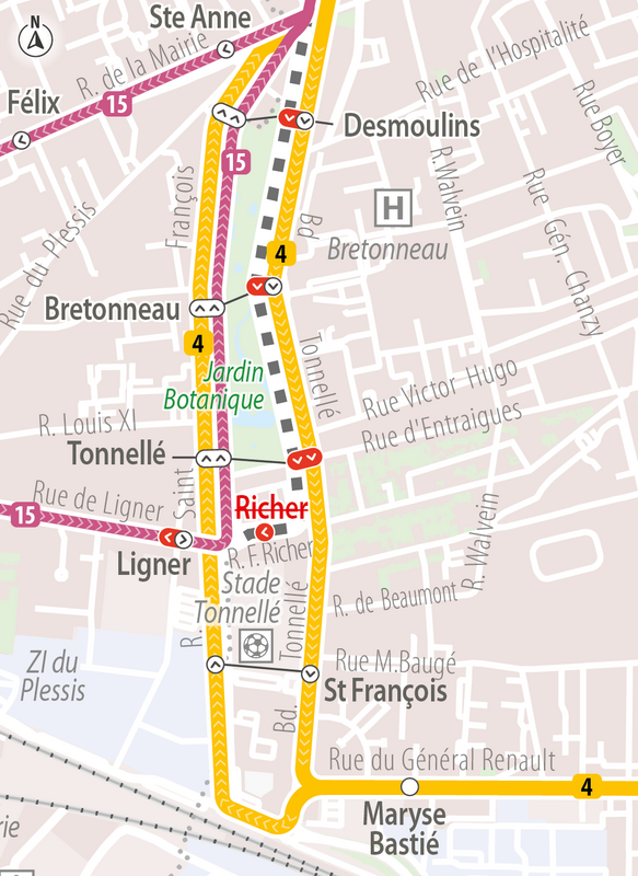- La ligne 4 direction Rempart passe par la rue Saint François et dessert les arrêts St François, Tonnellé, Bretonneau et Desmoulins.