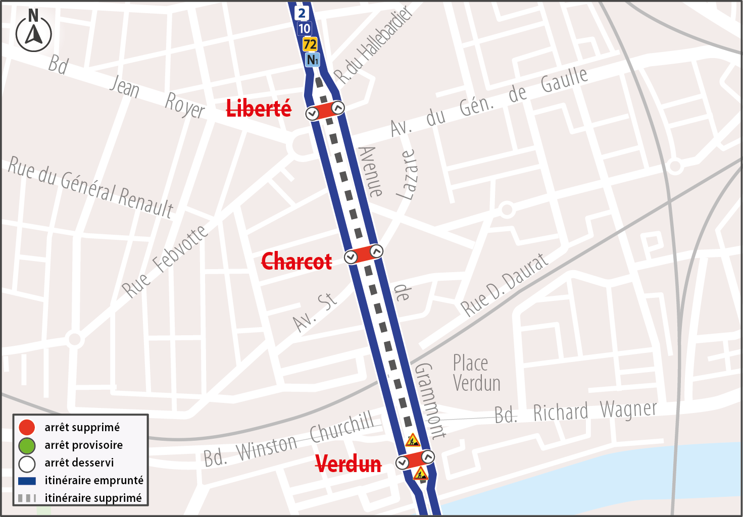 210N172Les arrêts Verdun, Charcot et Liberté ne sont pas desservis par les lignes 2, 10, 72 et N1dans les deux sens.