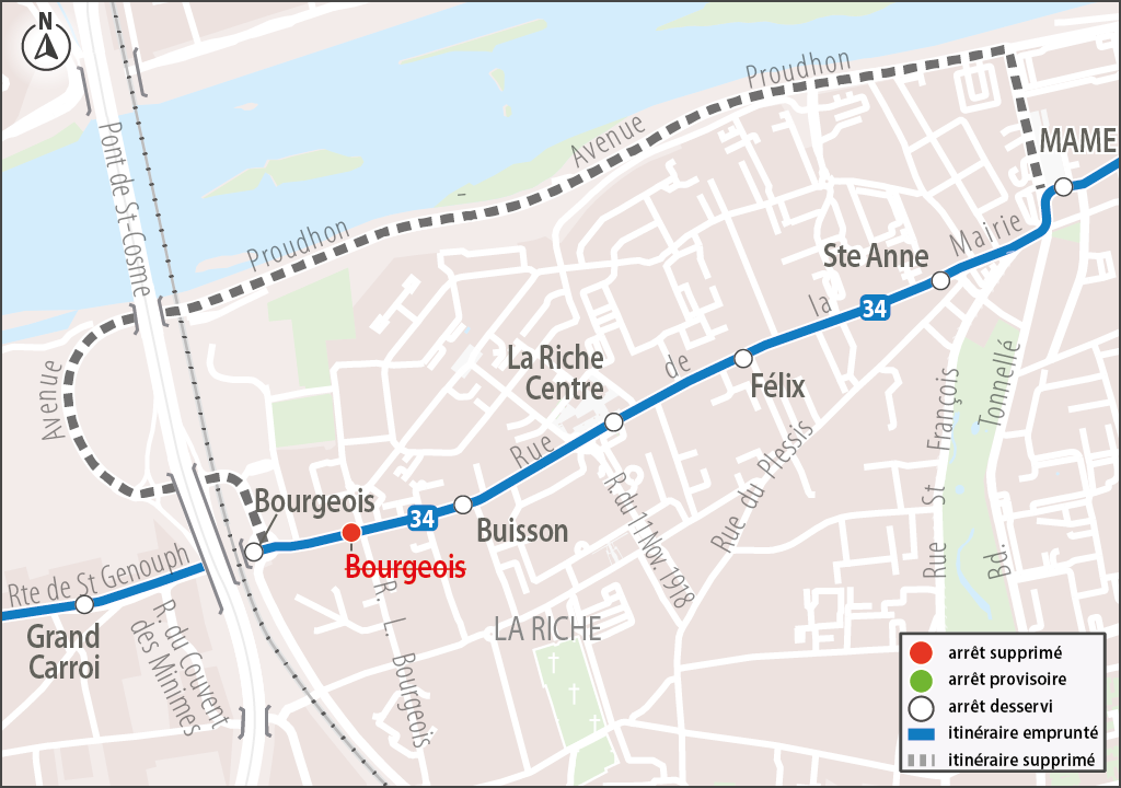 Les arrêts Buisson, La Riche Centre, Félix, et St Anne ne sont plus desservis par la ligne 34.