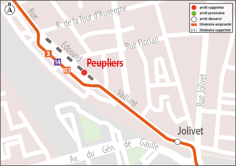 3a3b1483De 20h00 à 06h00, les nuits du lundi 24 au mardi 25 novembre et du mardi 25 au mercredi 26 novembre. L'arrêt Peupliers n'est pas desservi par les lignes 3ab, 14 et 83 dans les deux sens.