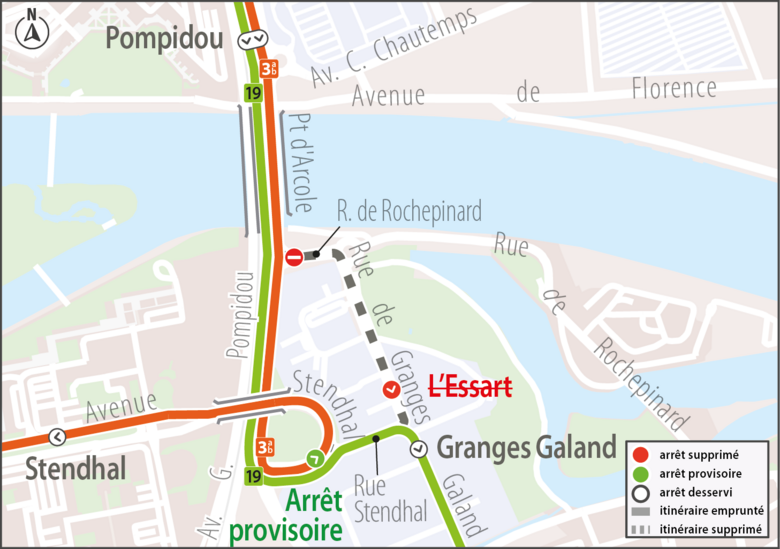 Ligne 19 > Granges Galand situé rue des Granges Galand.Tours - Travaux Quais Bus arrêts "Atlantes Duclos" du lundi 16 au vendredi 27 février