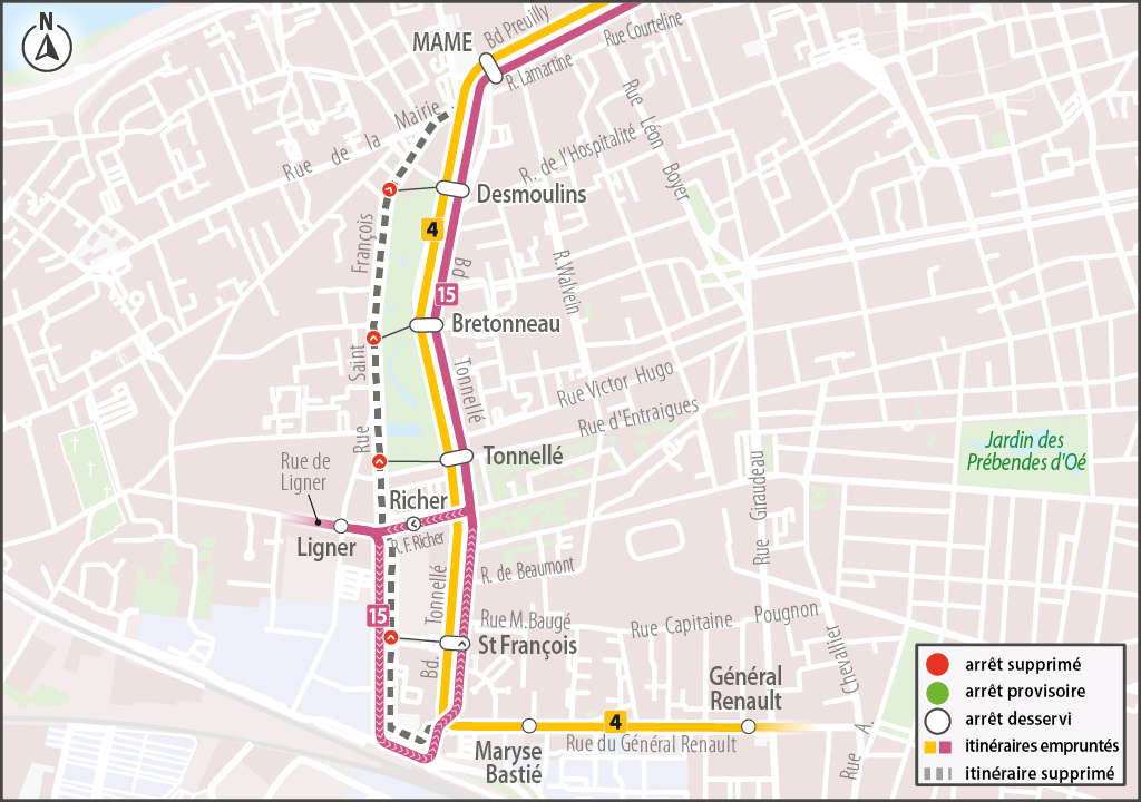 415Les arrêts St François, Tonnellé, Bretonneau et Desmoulins ne sont plus desservis dans la rue St François par les lignes 4 direction Rempart et 15 direction Blotterie.