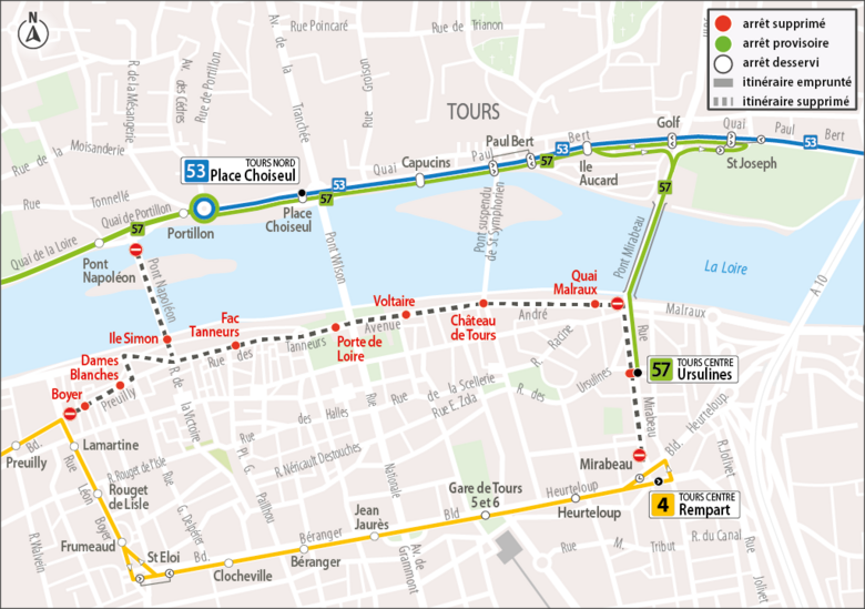 45357Les arrêts Boyer, Dames Blanches, Ile Simon, Fac Tanneurs, Porte de Loire, Voltaire, Château de Tours, Quai Malraux et Ursulines ne sont pas desservis par les lignes 4, 53 et 57 (dans les deux sens).