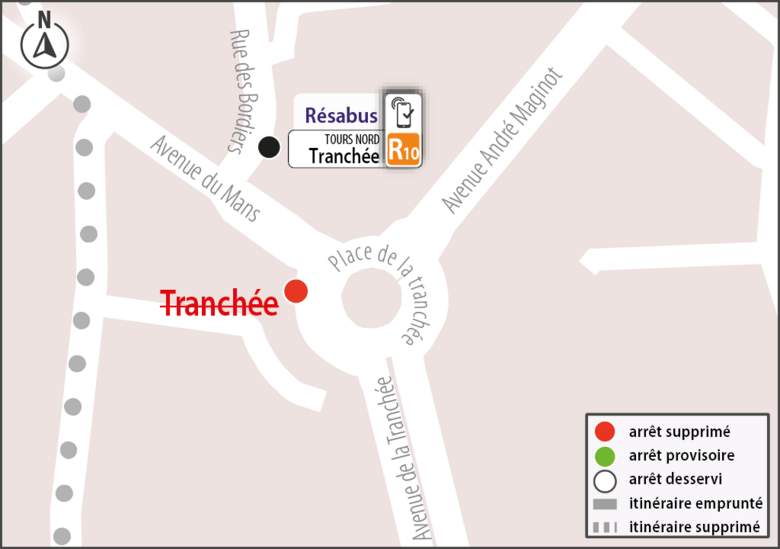 R10L’arrêt Tranchée, situé place de la Tranchée, n’est pas desservi par la ligne R10 dans les deux sens.