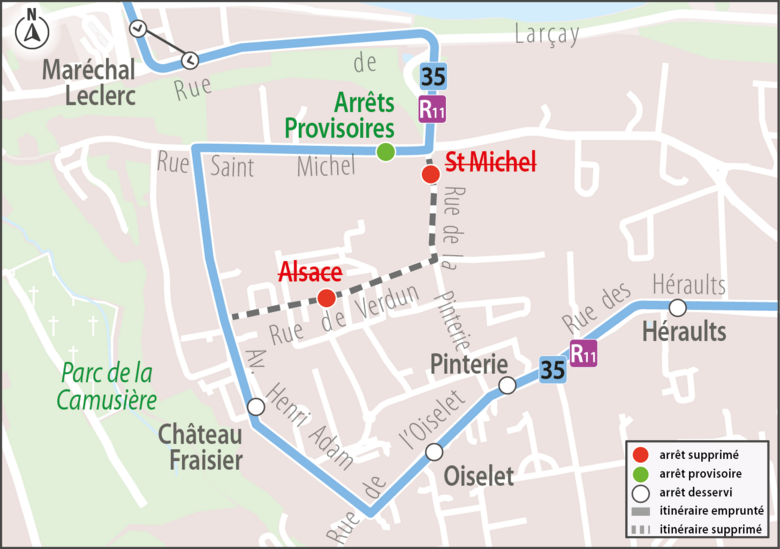 35R11Les arrêts St Michel et Alscace ne sont pas desservis par les lignes 35 et R11 deux sens.