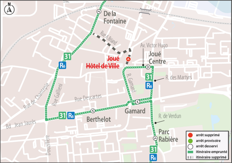 31R6L'arrêt Joué Hôtel de Ville n'est pas desservi par les lignes 31 direction Paul Fort et R6 direction Zone Joué / Ballan / Druye.