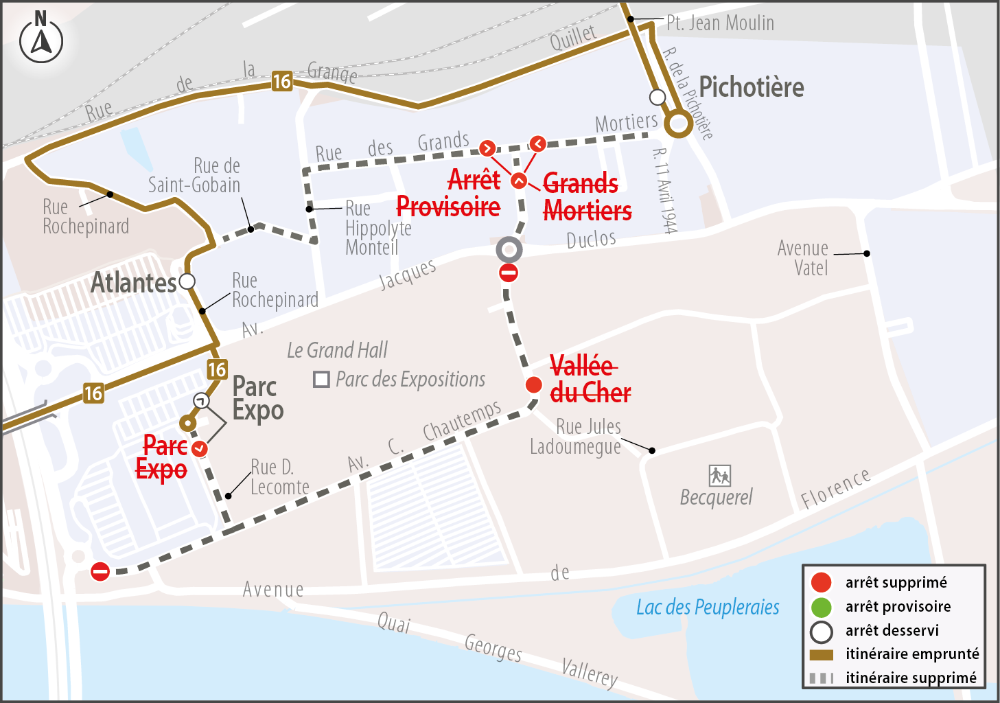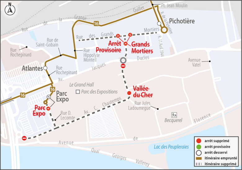 Les arrêts Vallée du Cher et Grands Mortiers (deux sens) et Parc Expo (direction Chaufferie) ainsi que l'arrêt provisoire (direction Chaufferie) ne sont pas desservis par la ligne 16.
