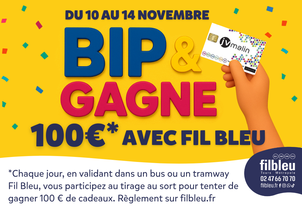 - Validez votre carte JV Malin chargée d'un titre Fil Bleu dans un bus ou un tramway Fil Bleu entre le 10 et le 14 novembre 2025