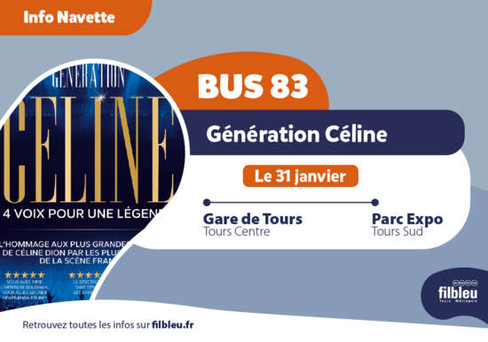 À l'occasion du concert de Génération Céline le samedi 31 janvier, au Parc Expo de Tours, je prends la Navette Parc Expo ligne !